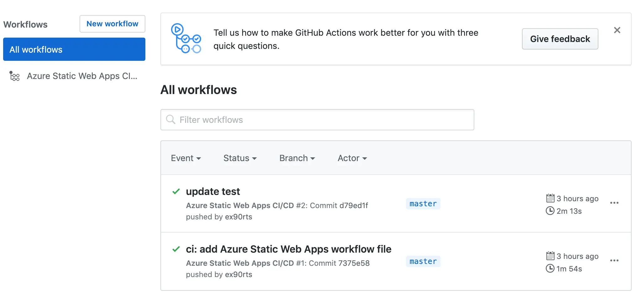 这个创建后,不仅仅有了基准代码,而且在经过 Azure Static Web Apps 创建绑定后,会帮你创建持续集成的 workflow,能够实现代码提交后自动化部署: