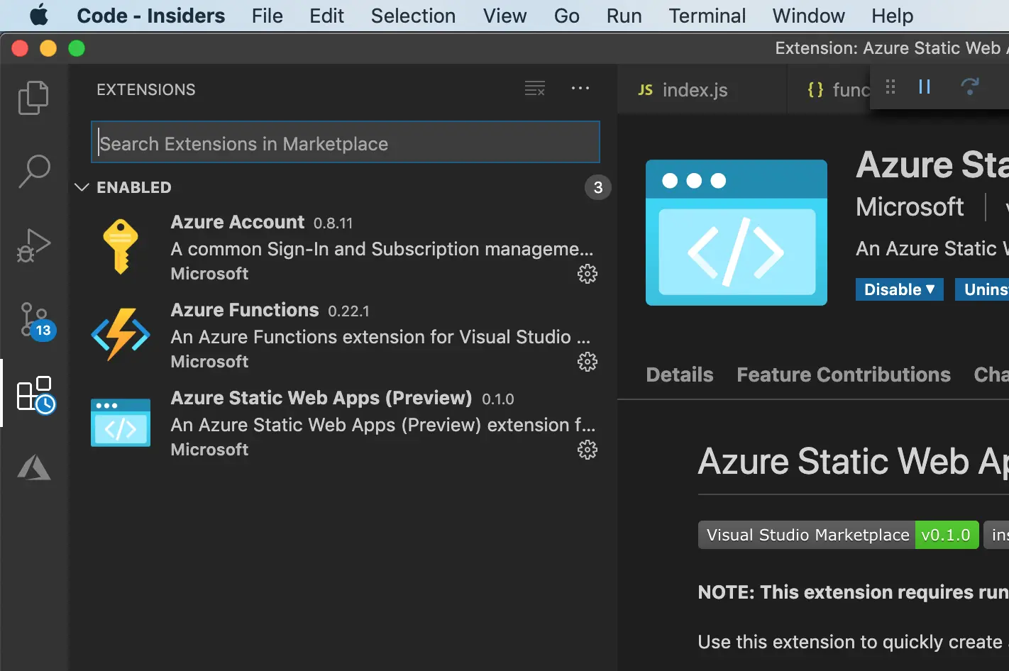 Azure Functions 可以通过在线 Portal 方式创建和维护,也可以通过 VSCode 插件的方式来创建和维护,我使用的是 VSCode 插件,需要安装以下插件(部分插件缺失也没关系,当使用功能依赖某个插件时,会自动提示安装):