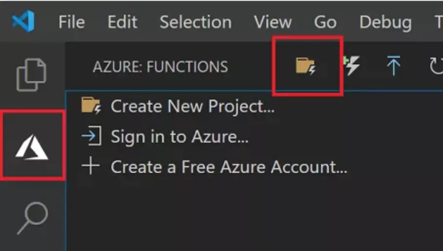 然后点击右侧的 Azure 图标进入相关功能,然后点击工具栏第一个新建项目按钮,选择前面刚刚新建的 api 目录,然后提供以下信息: