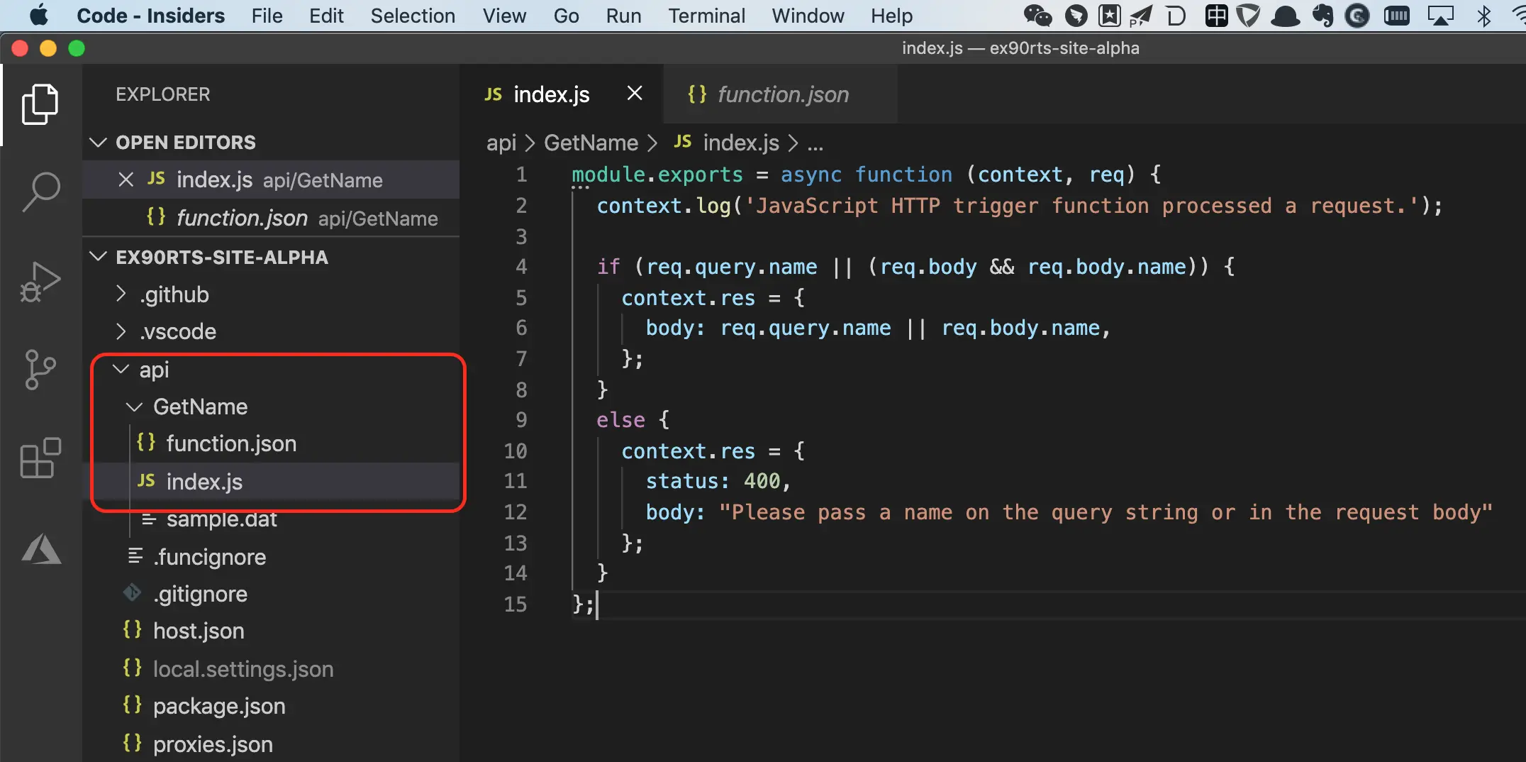 新建成功后文件树的 api 目录下会增加一个名为 GetName 的目录,下面就是编写具体的函数计算逻辑了,这里我们仅仅输出 URL 参数 name 作为演示: