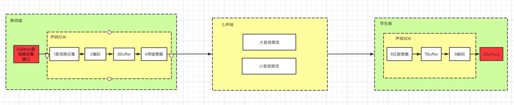 4传输策略:声网SDK根据教师端网络情况对Buffer做帧率处理&码率处理,然后上传。