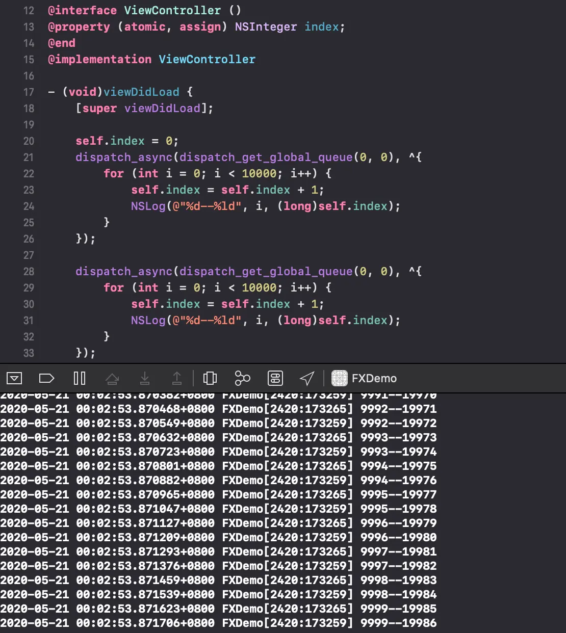 atomic修饰的index变量分别在两次并发异步for循环10000次后输出的结果并不等于20000。由此可以得出结论: