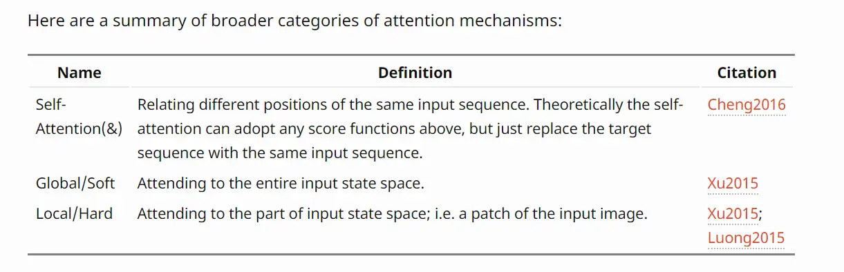 - 因此,hard attention 的输出是某一个特定的输入向量。soft attention 是一个带权求和的过程,求和集合是输入向量的集合,对应权重是 alignment function 产出的 attention weight。