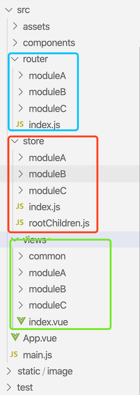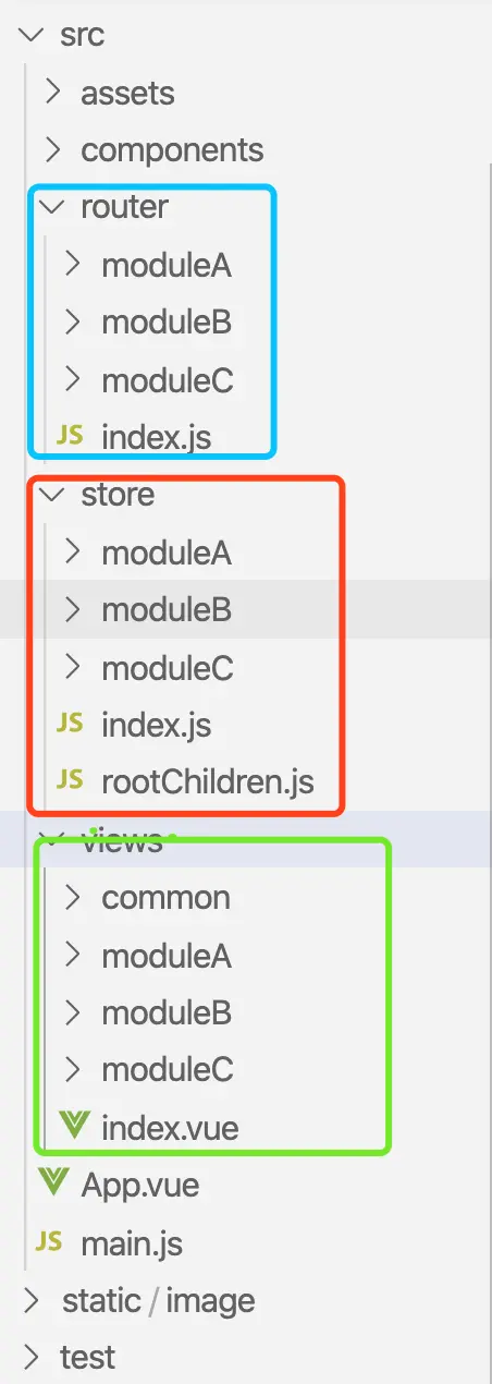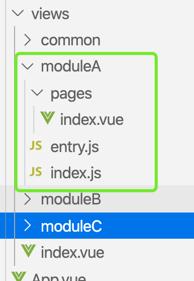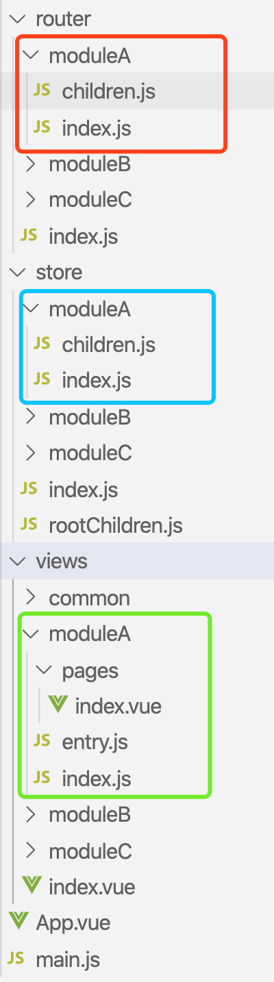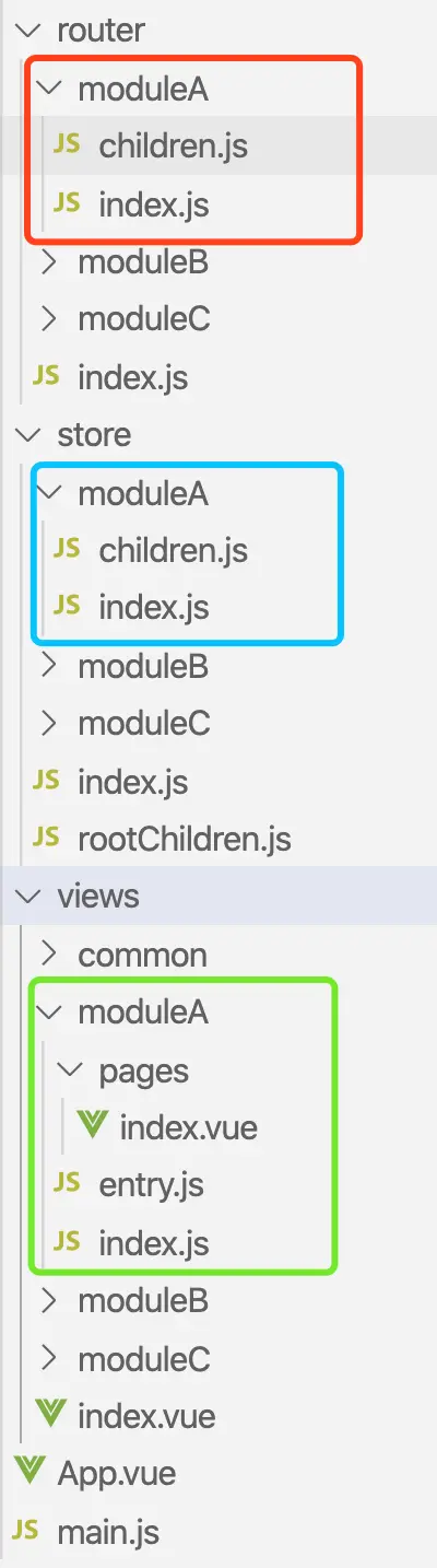 这里我建了三个模块,分别为moduleA,moduleB,moduleC。router/store/views文件夹分别对应着路由/状态管理库/模块页面,每个文件夹下面都有一个index文件,对应着每个模块路由/store/pages集成的地方,当然网上也有很多人喜欢每个模块的文件夹下面放着每个模块的路由啥的,咱们这里这样的构建 个人感觉在import引入文件的时候以及视觉效果更好一些,下面看一下每个模块里面的构造以moduleA为例, 如下图: