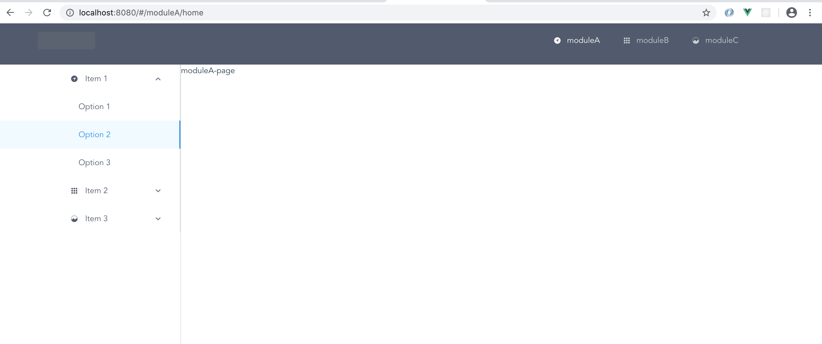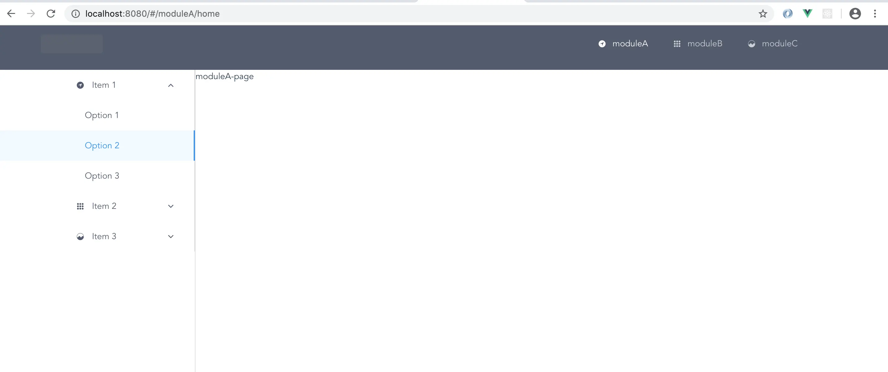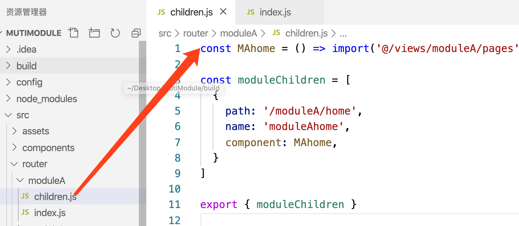这里是路由的示例,每个模块下有一个主路由,外加他的子路由,我们这里将子路由拆分出来单独成一个模块,方便维护以及其他模块的引入,其他(moduleB,moduleC)的路由模块与此相同的构建