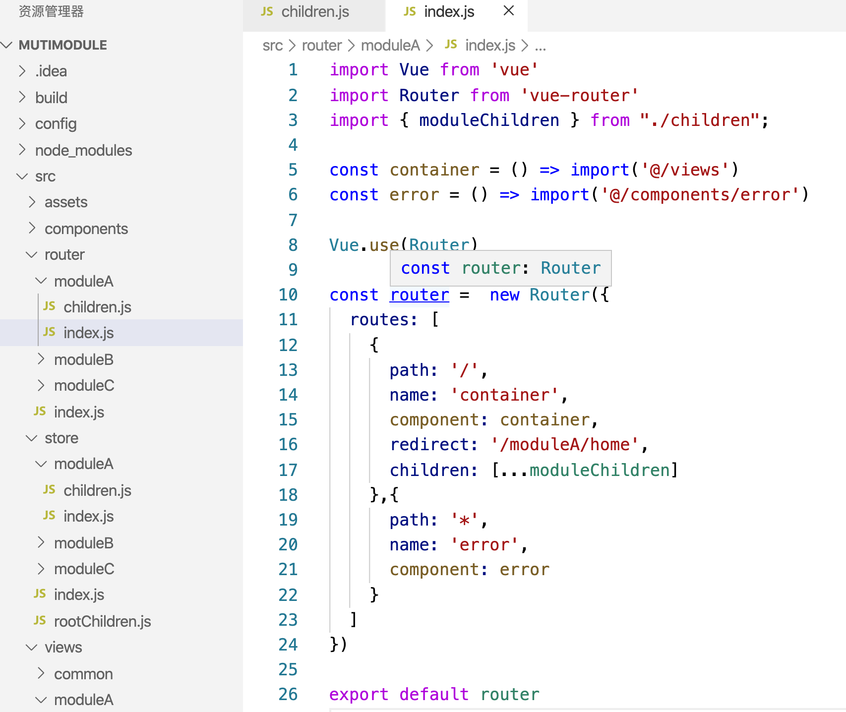 router/stroe文件夹下面的index.js是我们用来集成各个模块的路由文件chiildren.js,最后将引入到src的main.js里面