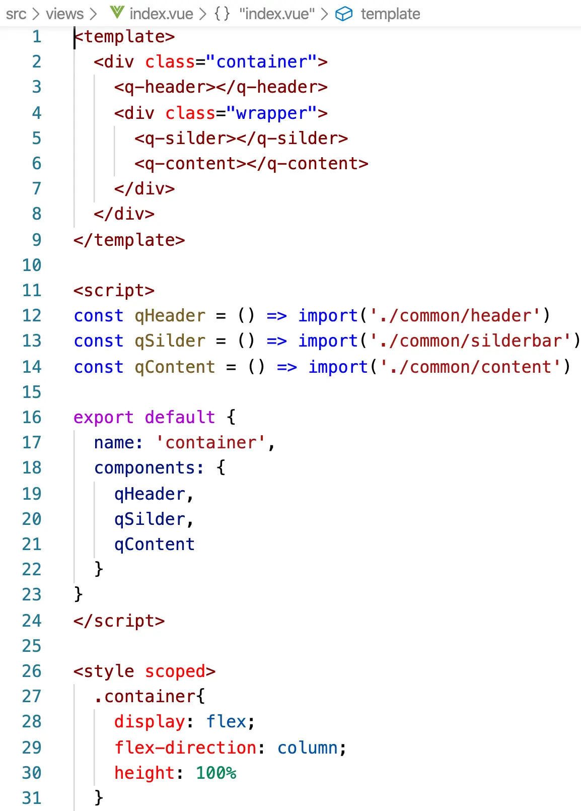 entry.js是我们每个模块的入口,pages文件夹里面放着每个模块的页面,当然全局的一些公共的组件啥的我们放到外层的common里,大家根据自己的需求去设置,views下面的index.vue是我们系统的入口文件,他的构造是这样的: