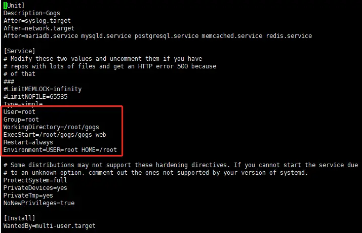 vi /etc/systemd/system/gogs.service将文件修改为: