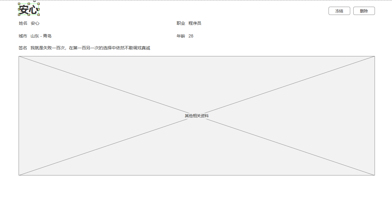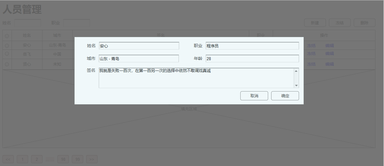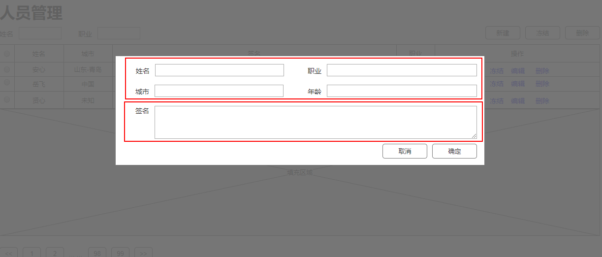 首先这个新建页面存在了几个字段(姓名、职业、城市、年龄、签名),如果我们按照做普通软件的思路,那么必然存在一个实体叫做人员,然后这个人员里边,必然存在相应的字段。