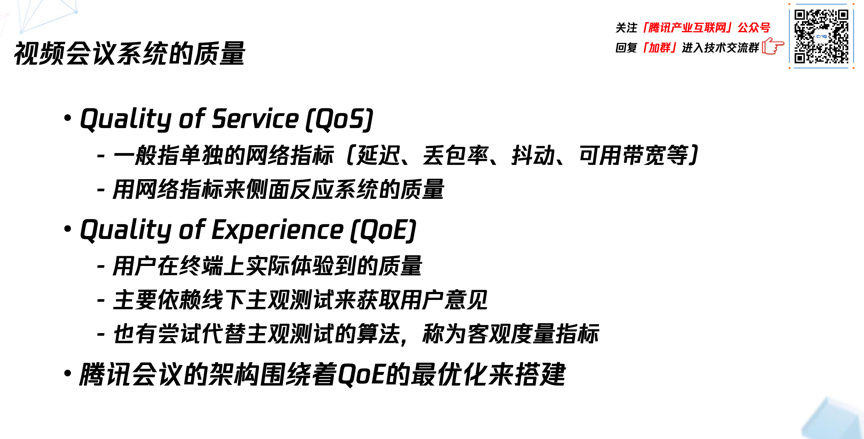 QoE指的是用户在终端上实际体验到的质量。它其实主要依赖线下用户主观测试,获取意见来得到的。但是在线上做优化的时候,实际上没有时间和条件来搜集用户的实时反馈,所以现在有很多的算法和模型,尝试通过一些指标侧面衡量QoE大概的水平,然后针对性地来做优化。腾讯会议架构的一切都是为了优化QoE。