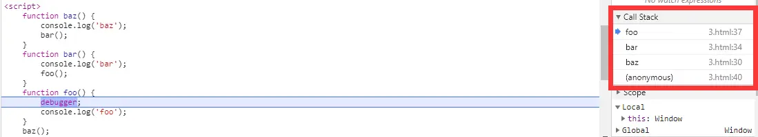 在这里要调用foo()就要先调用bar(),要调用bar()就要先调用baz(),因此在这里调用栈应该是baz()->bar()->foo()。在这里我们还可以用浏览器中内置的开发者工具来查看调用栈。