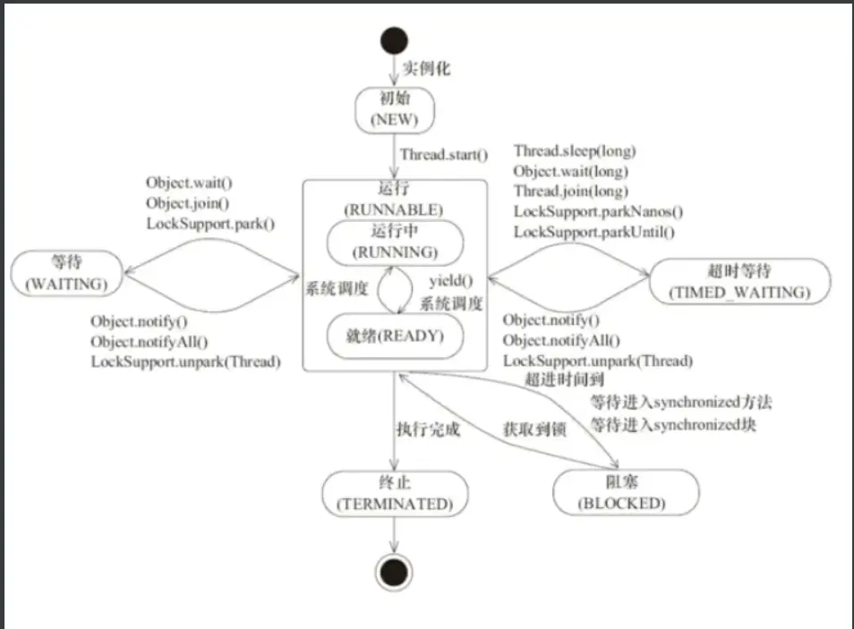 - Runnable (运行) :包括 Running (当前线程正在执行) 和 Ready (还没有执行,处于就绪状态,等着 cpu 调度为其分配时间片)
