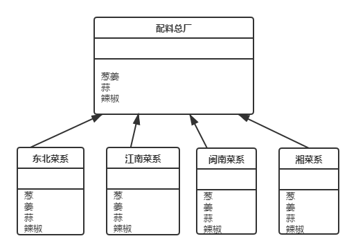 就这样,我们的规模又翻了一番,居然有人开始挑剔我们的配料问题(这些顾客真是让人不省心)。原因是因为我们的分店有时候由于采购问题,大葱买不到只能用小葱代替,没有老姜只能用生姜,顾客又没法接受辣椒不是小米辣......无奈之下,我们只能抽调一个部门来负责配料的配给了。这是我们类图: