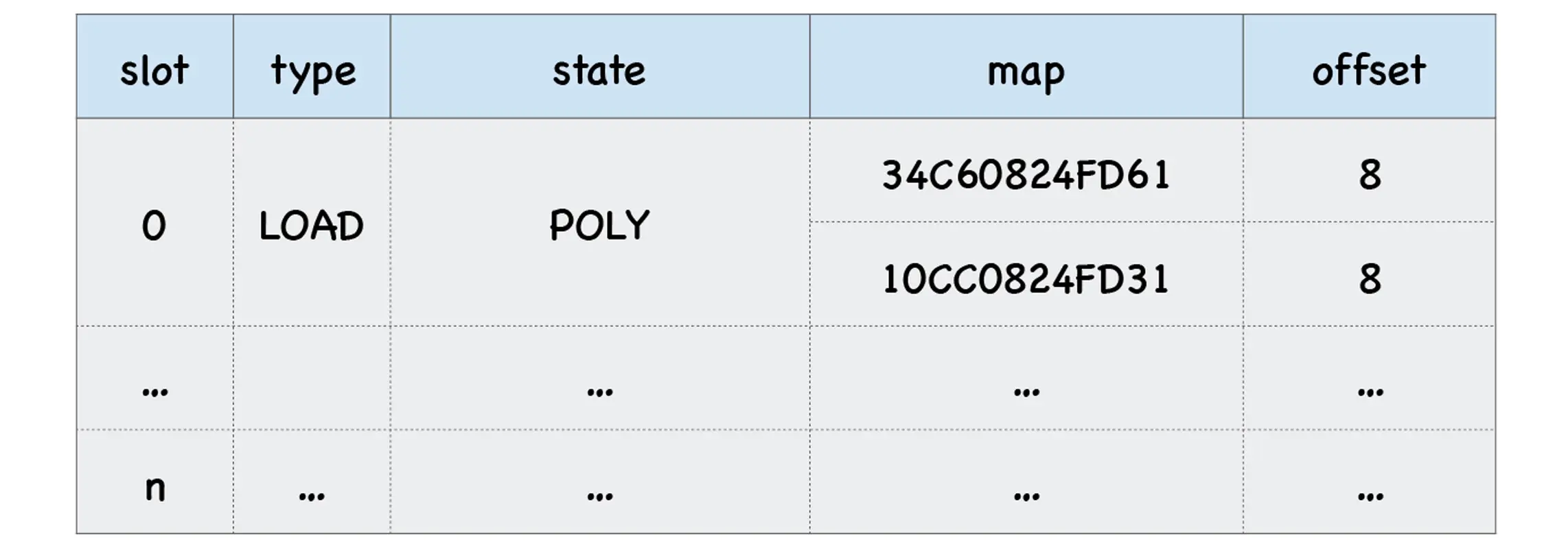 第一次执行函数的时候,v8会将对象的一些信息记录到slot中,第二次执行函数会将第一次记录的信息和第二次的信息进行比较,如果相同直接调用,如果不同会将这部分信息记录在同一个位置。依次类推一个slot会记录多份信息(当然也是有一定数量限制的)。 同一个slot记录多个信息的情况就可以称之为PIC多态内联缓存,而多态内联缓存可能会进行多次的比较操作,自然性能上不如单态内联缓存,也就是为什么开篇中第二段函数执行的比第一段来的慢。