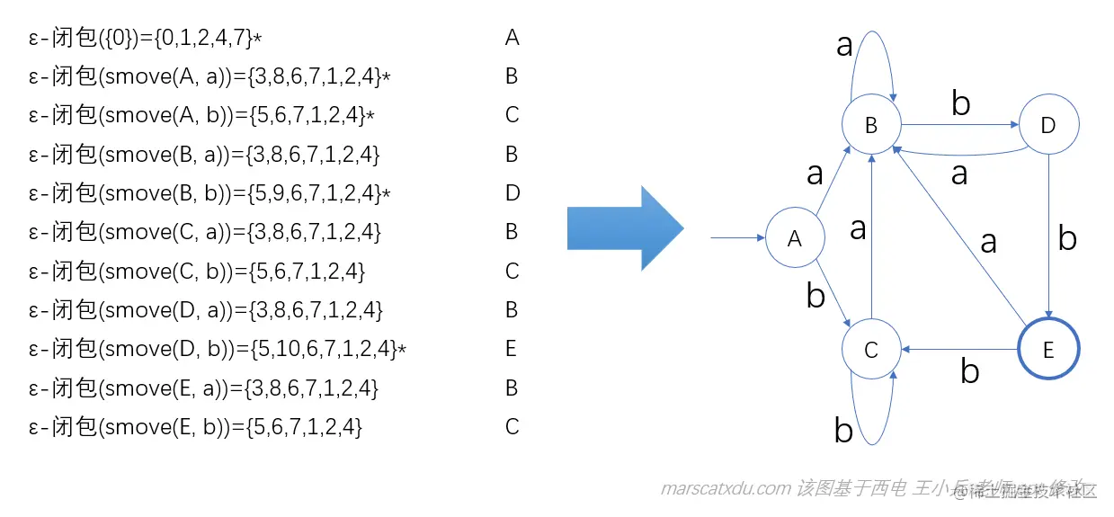 因为我们在每一步都考虑了下一步所有可能的转移,因此收集到的状态集合,就都是“确定”的了。 我们把一个个不确定下一步收集起来变成一个下一步集合,这样就实现了将不确定的下一状态确定化