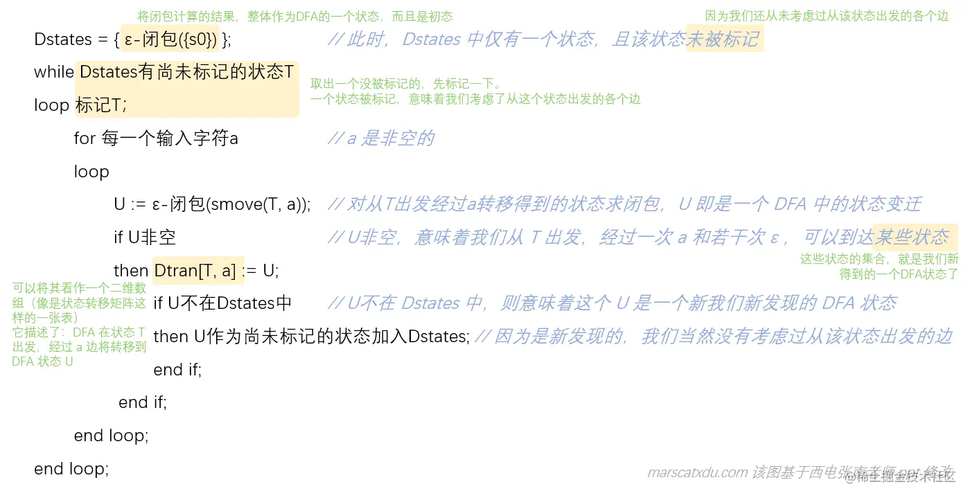 该算法将从 NFA 的初态开始,生成可达状态机状态之间的转移关系。