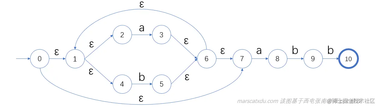 0 ε* A aε* B bε* C bε* D,即,通过一个输入字符进行直接转移后,再经过若干次的空转移,转移到了下一下一状态集。路径上的标记是 ε*aε*bε*bε*,去掉空转移就是 abb 了,即 ε*aε*bε*bε* = abb。