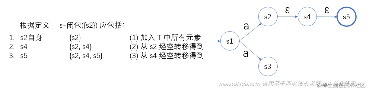 定义:状态集 T 的 ε-闭包(T) 是一个状态集,其满足: