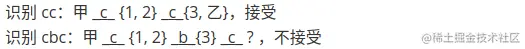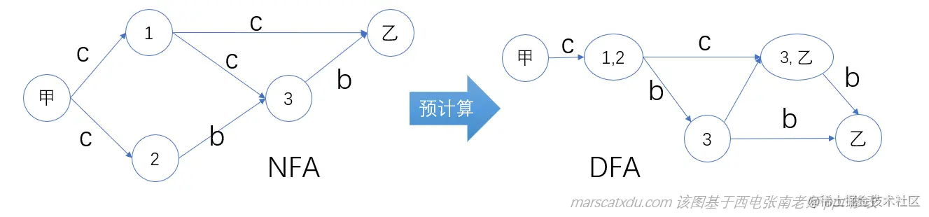 这个问题的模型实际上是个 NFA,就像图上画的那样。对于该 NFA,我们可以通过预计算的方式,建立一个经过状态转移到达到达状态集的 DFA(DFA 中的每个状态都是一个状态集——以原来的 NFA 中的某些状态为元素组成的集合)。该 DFA 与原 NFA 等效,能够识别 cc、ccb、cbb