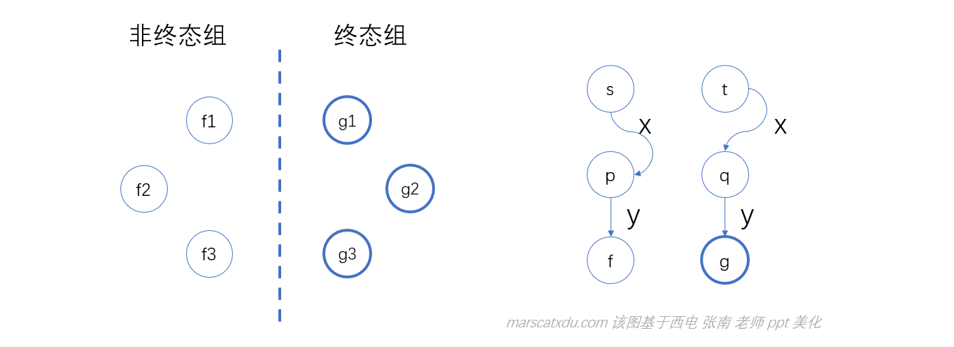 - 若分别从 s 和 t 出发,沿着标记为 x 的路径到达的两个状态p、q是可区分的,那么 s 和 t 也是可区分的。 这里的 p、q 是我们已知可区分的——因为对于 p、q,如果有相同的输入序列 y 使得他们分别到达终态和非终态,那么 p、q 就是可区分的了。一旦 p、q 可区分,则 s、t 经过输入序列 xy 就能够分别到达 f、g ,也就随之满足可区分的定义了