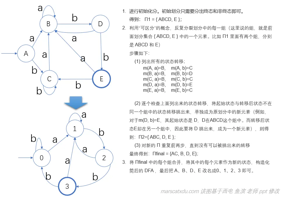 (其实就是把DFA中的各个状态划分成几个等价类,然后把等价类内的状态进行合并。这样最终得到的最小DFA的状态数就是之前我们划分的等价类数。每一个等价类对应最小DFA中的一个状态)