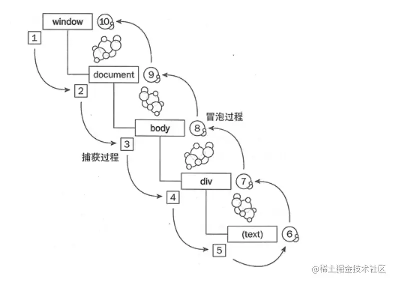 Netscape定义了一种叫做事件捕获的处理方法,事件首先发生在DOM树的最高层对象(document)然后往最深层的元素传播。在上面的例子中,事件捕获首先发生在document上,然后是html元素,body元素,button父节点、最后是button元素。