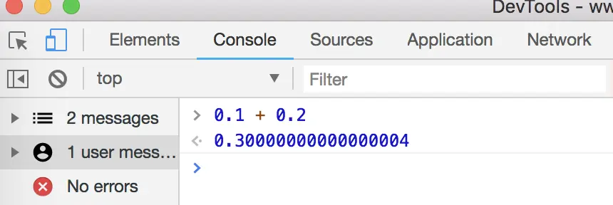 其中 JS 的 number 类型是浮点类型的,在使用中会遇到某些 Bug,比如 0.1 + 0.2 !== 0.3。更详细的部分会在之后提到。