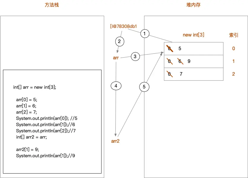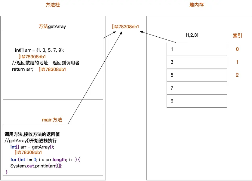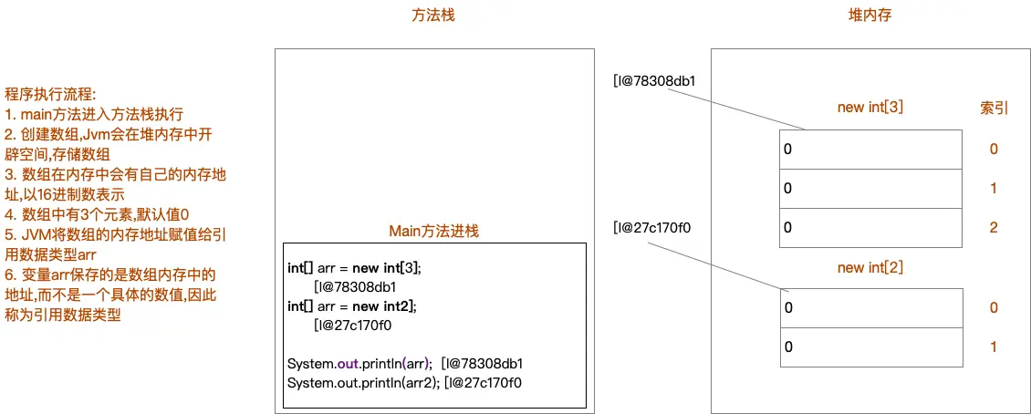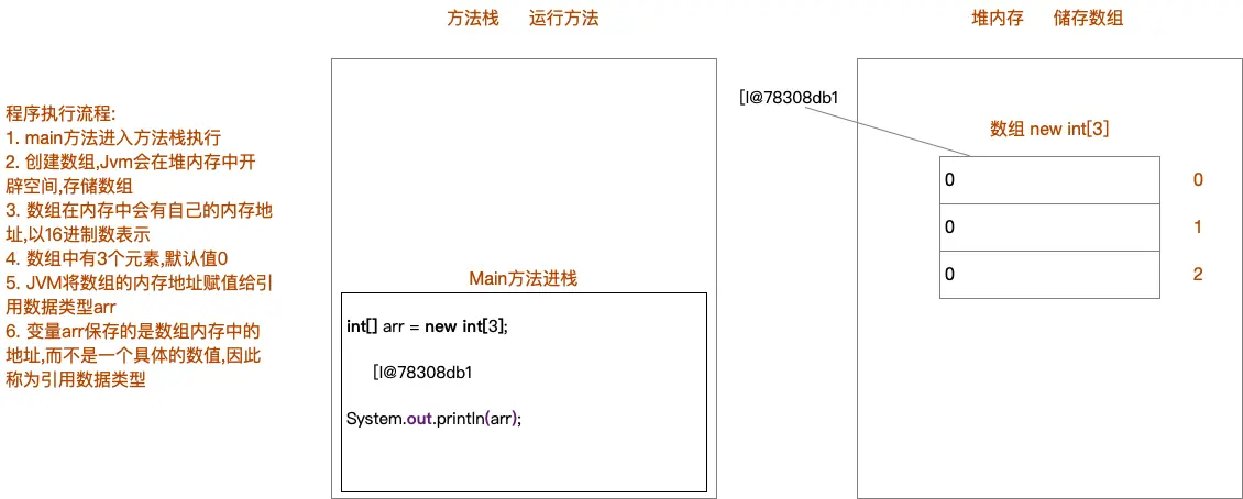 以上方法执行,输出的结果是[I@78308db1,这个是什么呢?是数组在内存中的地址 new出来的内容,都是在堆 内存中存储的,而方法中的变量arr保存的是数组的地址。