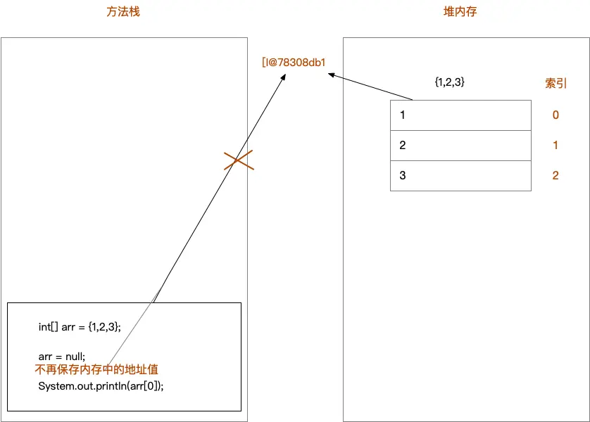 arr = null这行代码,意味着变量arr将不会在保存数组的内存地址,也就不允许再操作数组了,因此运行的时候会抛出NullPointerException空指针异常。在开发中数组的越界异常是不能出现的,一旦出现了,就必须要修改我们编写的代码
