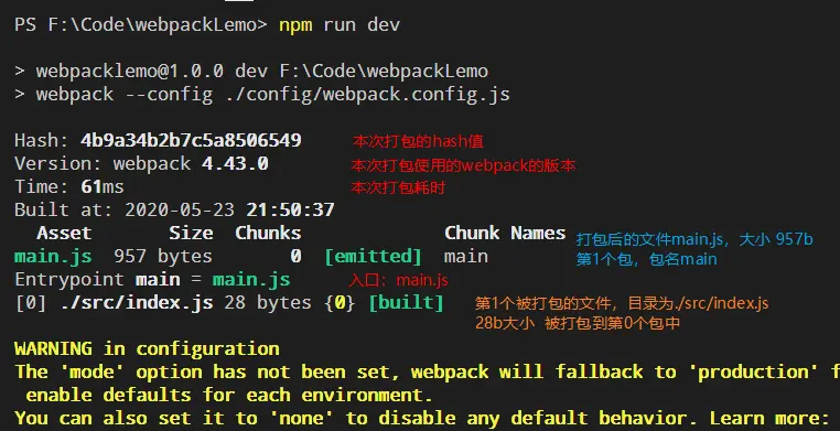 接下来只需在命令行里执行 npm run dev 就能进行第一次打包