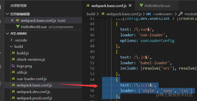 vscode中ctrl+p搜索文件webpack.base.conf.js打开后配置如下