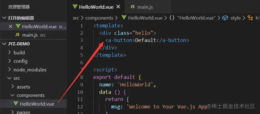 测试ant-design-vue是否成功引入,在组件HelloWorld.vue中加入