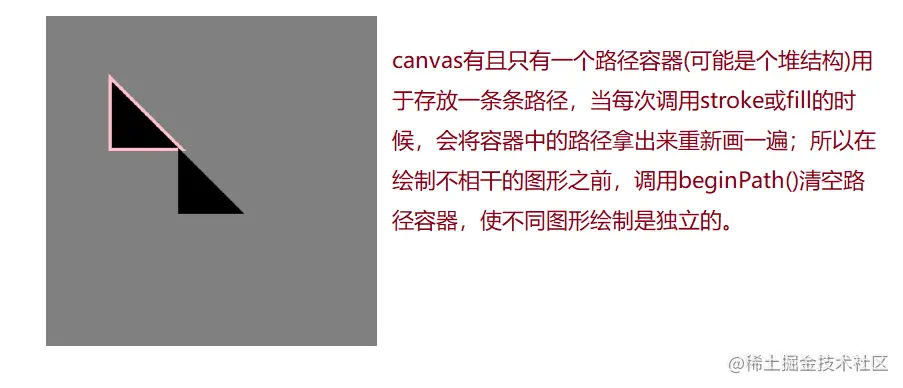 如何理解beginPath呢?看一个实例,以及效果图 我只是像绘制一个描边三角形和另外一个填充的三角形,但是见效果图,把前面的本只是描边的三角形也重新填充了一遍;