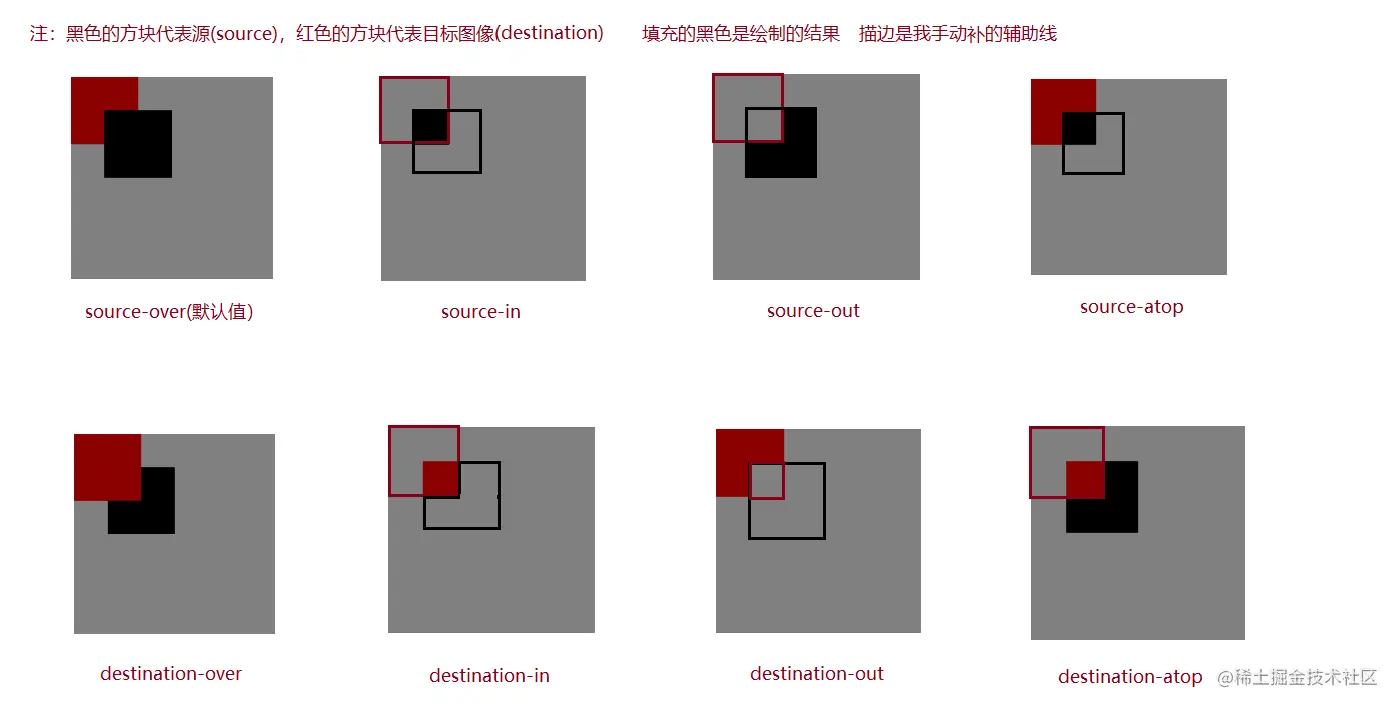 ctx.globalCompositeOperation: (属性值不止下方八种,这八种比较常用)