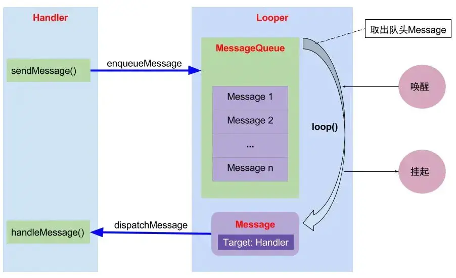 - Handler 的背后有 Looper、MessageQueue 支撑,Looper 负责消息分发,MessageQueue 负责消息管理;
