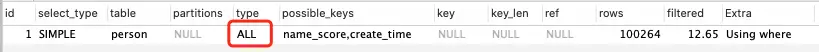 用了全表扫描!理论上应该用 name_score 或者 create_time 索引才对,从 WHERE 的查询条件来看确实都能命中索引,那是否是使用 SELECT * 造成的回表代价太大所致呢,我们改成覆盖索引的形式试一下