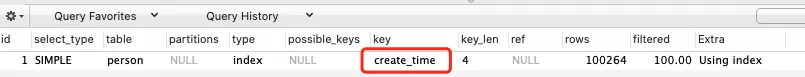 从结果上看它选择了 create_time 辅助索引,显然 MySQL 认为使用此索引进行查询成本最小,这也是符合我们的预期,使用辅助索引来查询确实是性能最高的!