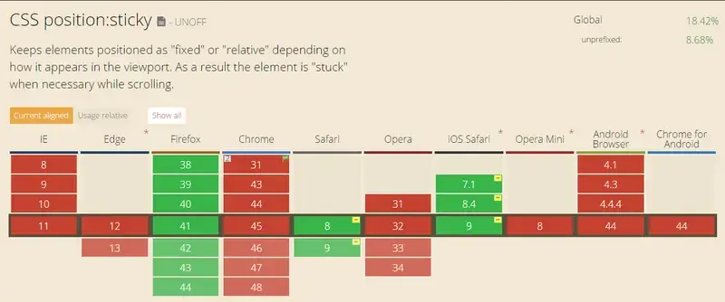 sticky目前仍是一个试验性的属性,并不是W3C推荐的标准。它之所以会出现,也是因为监听scroll事件来实现粘性布局使浏览器进入慢滚动的模式,这与浏览器想要通过硬件加速来提升滚动的体验是相悖的。具体情况可以看下图,基本上可以说这个属性使用的浏览器只有FireFox和iOS的Safari