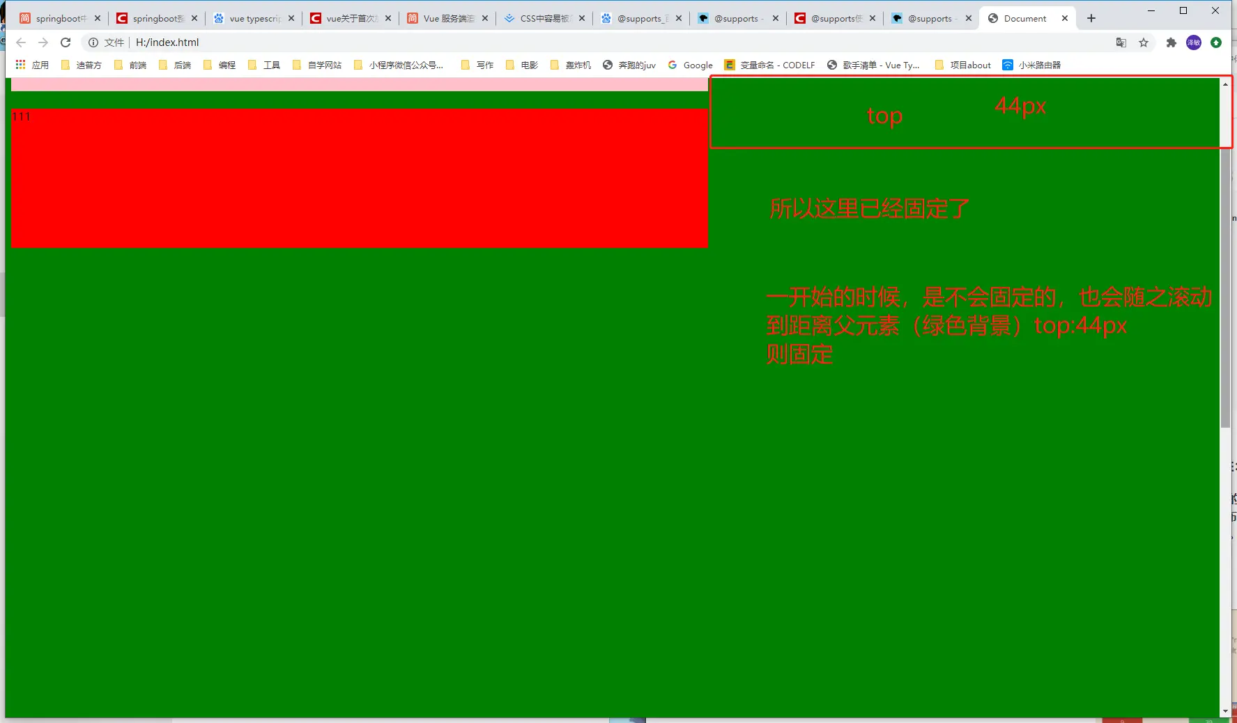 Document body{ width: 1000px; height: 2000px; background: green; } div{ position: sticky; top: 44px; width: 1000px; height: 200px; background: red; } span{ display: inline-block; width: 1000px; height: 200px; background: pink; } 5555554 111