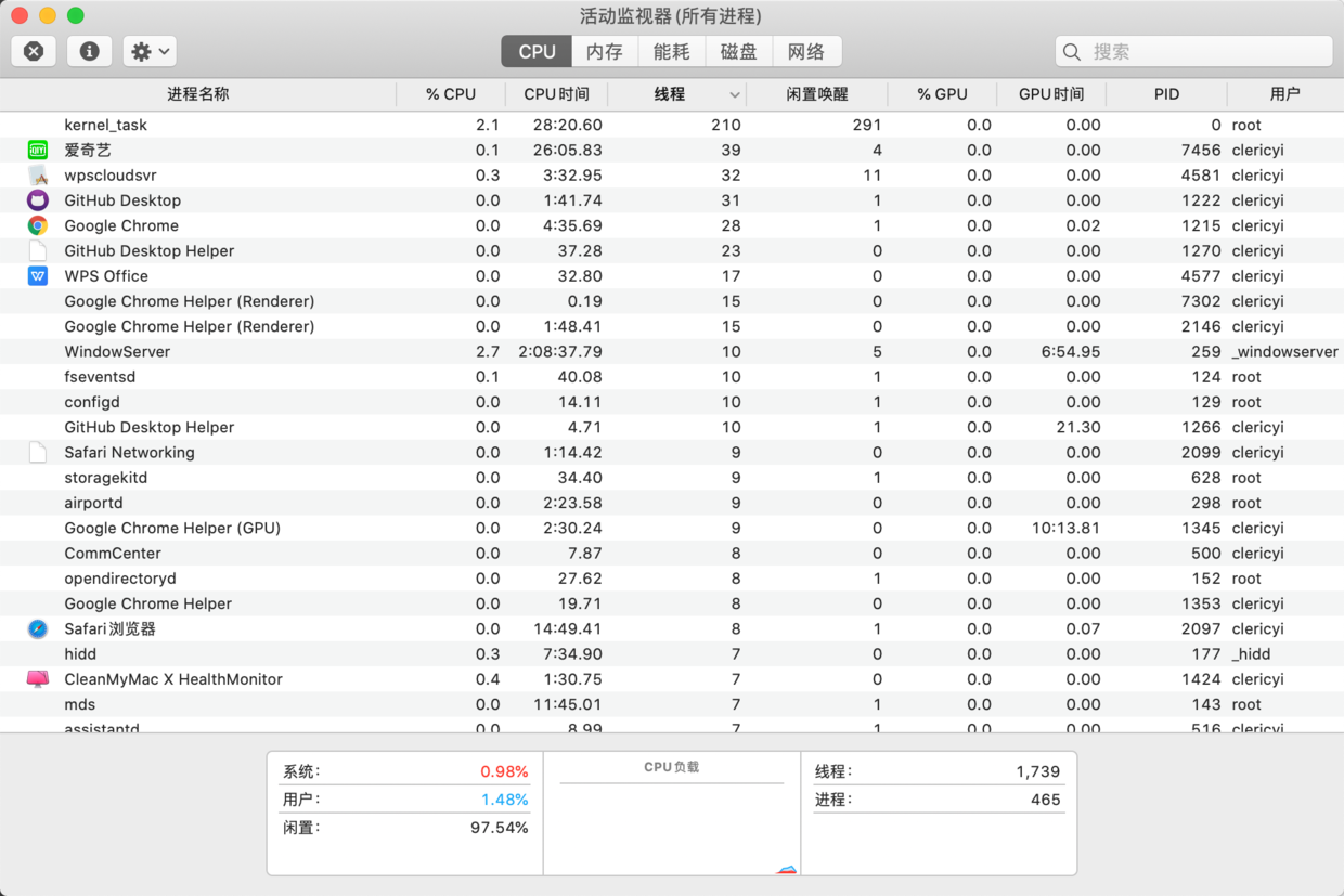 先来一张我随手截的活动监视器的图,分清一下什么叫做进程,什么叫做线程。