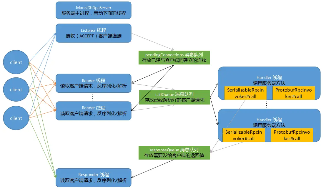 - Handler: 多线程并行地读取调用请求,解析调用方法并执行调用