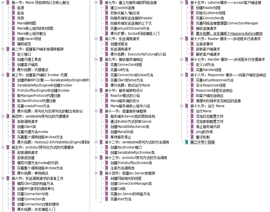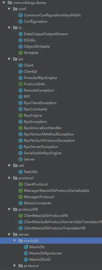 当然我们这本书并不是源码分析类教程,而是强调动手能力。在这里我会带着大家按照 Hadoop RPC 源码从 0 到 1 完整敲一遍,代码量在 4600 行左右。为了让不熟悉 Hadoop 或 RPC 的朋友也能够学习,我将 Hadoop RPC 稍微做了一点改造,赋予了新的业务含义,也有自己的名字,叫 Manis。Mnias 源码相比于 Hadoop RPC源码还原度为90%。为什么不是100%呢?一方面为了突出重点,我会把不太重要、不是很核心的技术舍弃掉。另一方面为了符合新的业务定义,我会做一些改进,而不是照搬完全 Hadoop RPC。