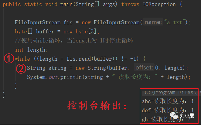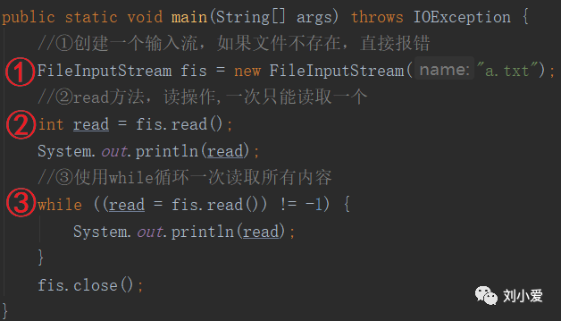 它是输入流最上层的父类,是一个抽象类,其中它有一个子类叫FileInputStream。