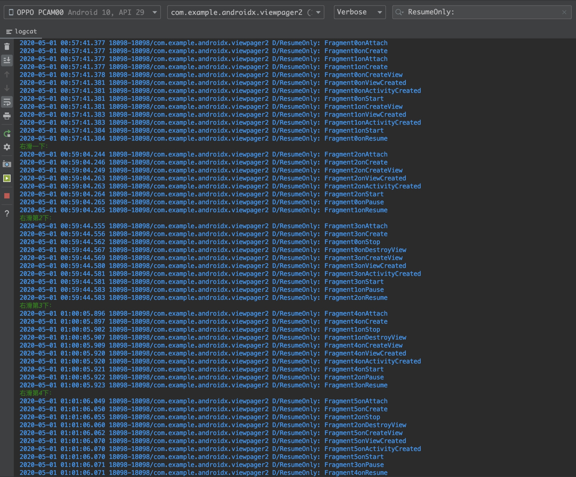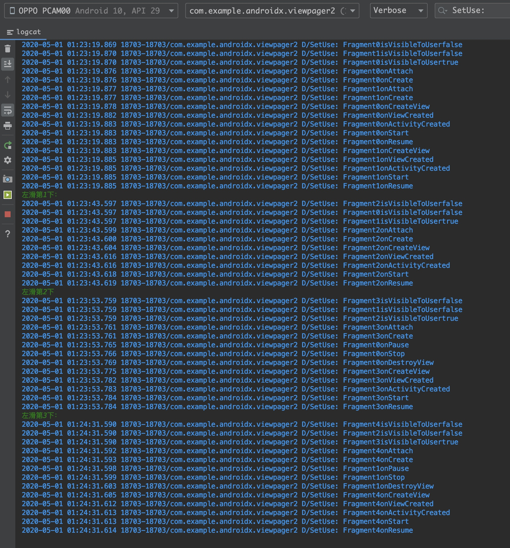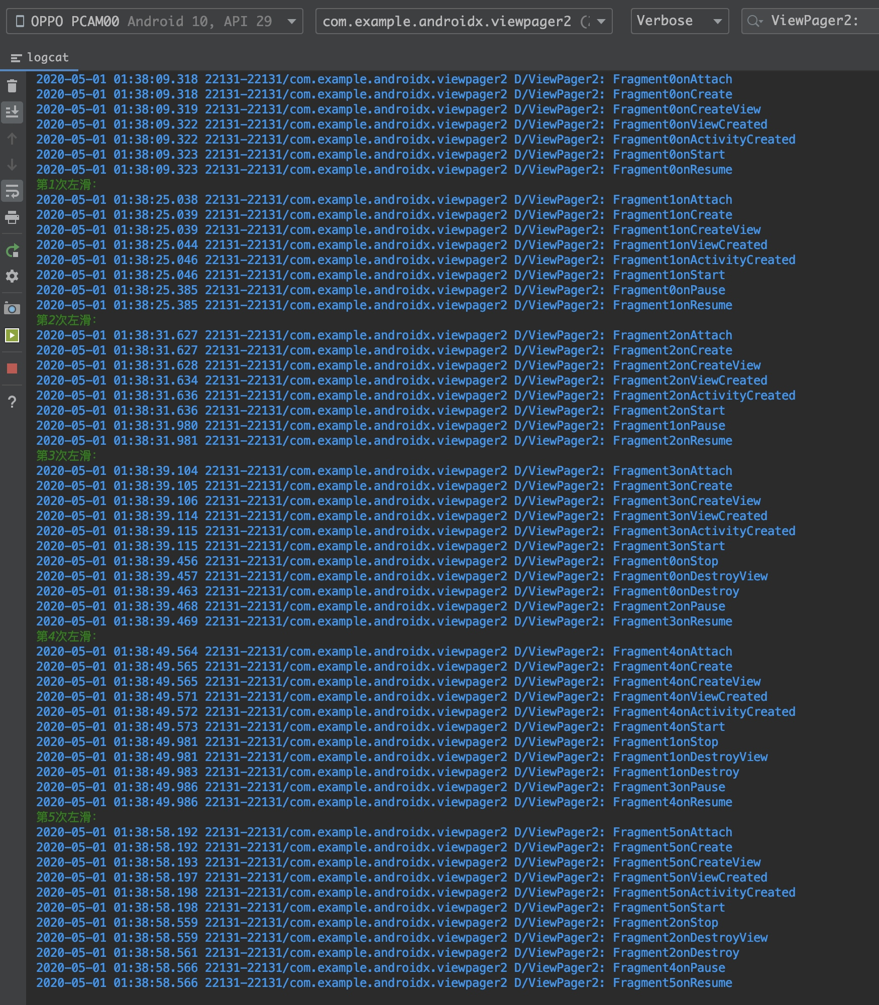 这个代码是在google的ViewPager2的代码基础上新增了三个页面进行日志打印, 代码地址:github.com/luorenyu/Ex…