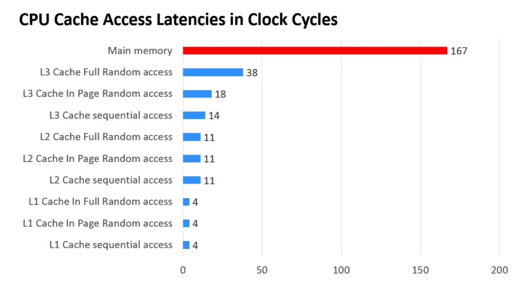 从上图可以看出内存的响应速度要比 CPU 缓存慢很多。