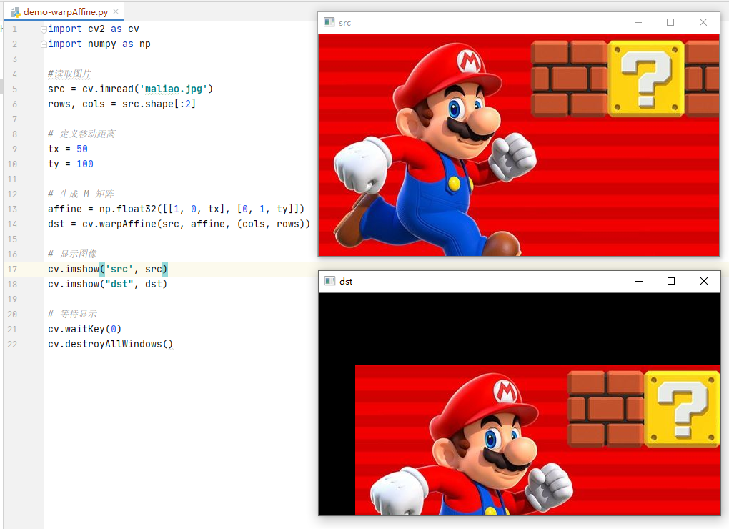 我们通过 Numpy 来产生这个矩阵(必须是float类型的),并将其赋值给仿射函数 warpAffine() ,下面来看个示例: