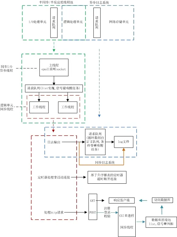 - 使用 线程池 + 非阻塞 socket + epoll(ET 和 LT 均实现) + 事件处理(Reactor 和 Proactor 均实现)的并发模型