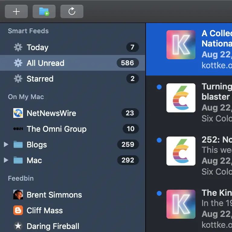 NetNewsWire 是一款免费的 RSS 阅读器,除了支持 RSS,它也支持 Atom,JSON Feed 和 RSS-in-JSON 格式。