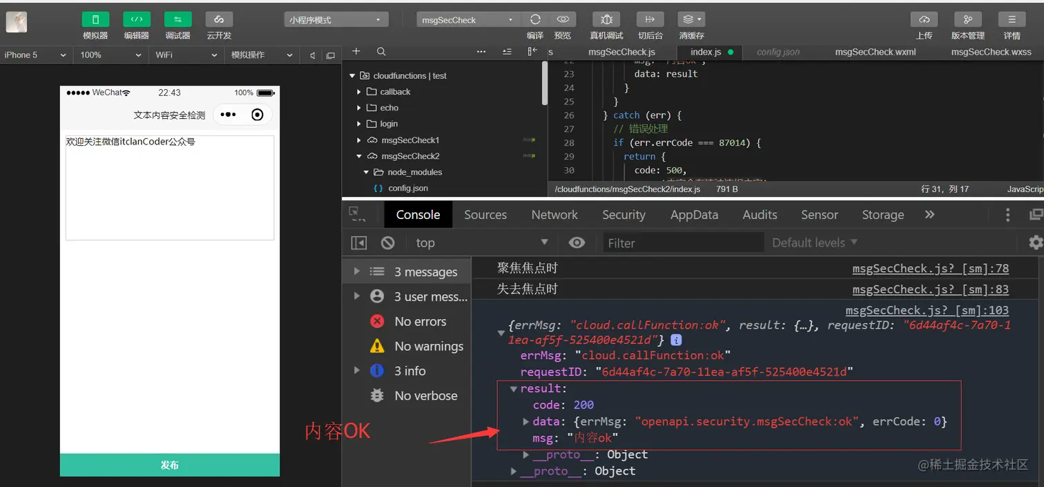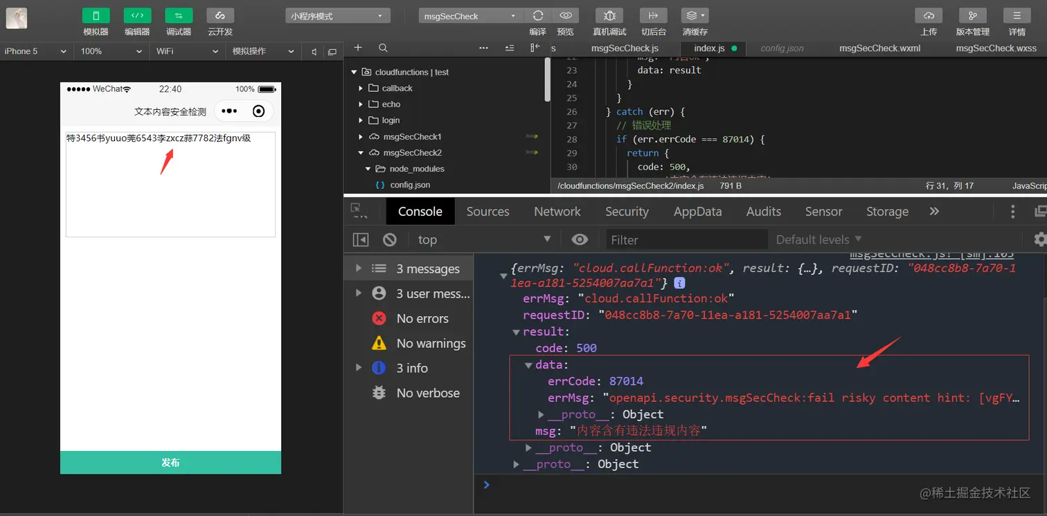 你会发现在小程序端检测一段文本是否违规,就这么几行云函数代码,就完成了这个文本内容校验功能。