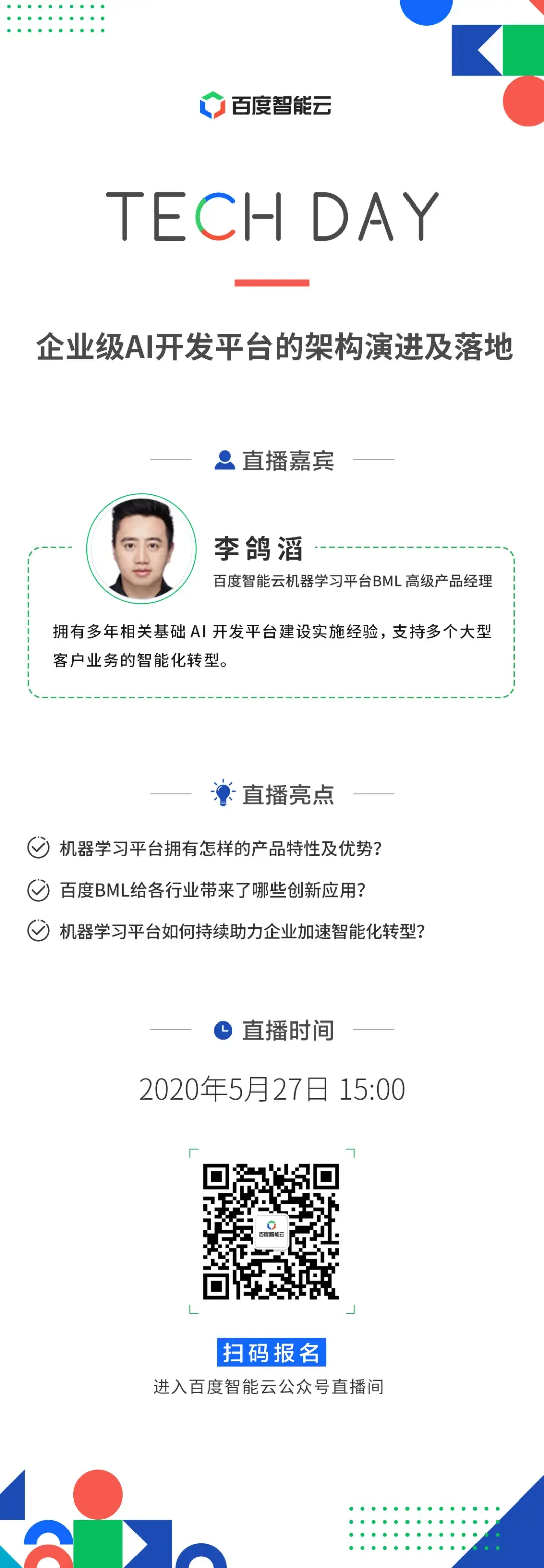 5月27日下午15:00,百度智能云机器学习平台BML高级产品经理李鸽滔将在百度智能云微信公众号直播间为大家带来“企业级AI开发平台的架构演进及落地”的分享,帮助传统企业快速构建AI能力,解决风控、信贷、缺陷检测等典型场景所遇到的问题。
